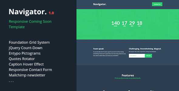 Navigator is Responsive Coming Soon Template crafted with HTML5, CSS3 and jQuery based on Foundation Grid System.