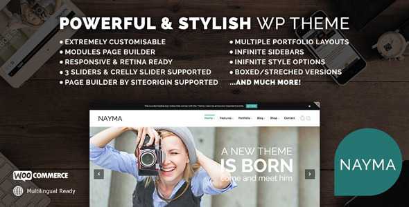 NAYMA is a stylish, multi-purpose and responsive WordPress theme suited for many, many different types of websites. Project showcasing, Shopping sites, Business websites, you name it. It was developed along WordPress best practices, with great attention to details to make your work easier than ever! With lots of options, an extremely flexible framework and still highly intuitive.