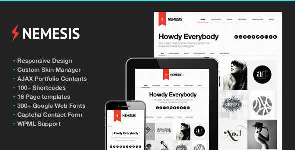 Nemesis is the Reponsive Wordpress theme built for creative freelance designer website. It comes with many cool features ex. Skin manager, Flexible portfolio contents (including stylish AJAX portfolio), customizable elements’s color, font and background image and patterns. There are also 100+ advanced shortcodes with Shortcode Generator support. You can also use 300+ custom fonts from Google Web Fonts.