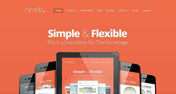 Nimble is a big, bold, and beautiful theme that doesn’t let its own style get in the way. With each design I struggle to strike a balance between style and function. Nimble’s colors are toned down but still delicious and its style is bold but still leaves room to breath. Browsing Nimble on a 27″ Cinema Display is quite a treat, but so is browsing the theme on a small screen as well due to Nimble’s fully responsive design.