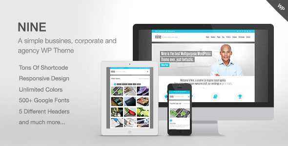 Nine is a Responsive Multi-Purpose WordPress Theme (try resizing your browser), suited for business websites and users who want to showcase their work on a neat portfolio site.The clean design of Nine can be used for any type of website; business, corporate, portfolio, blog, products, etc…