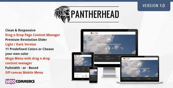 PantherHead is powerful multipurpose WordPress theme. Fullwidth or boxed layout, dark or light, 11 predefined skin or choose your favorite color. Awesome drag and drop content manager with custom skin per row basis, sidebar manager, mansory layout, premium revolution slider included, off-canvas mobile menu, awesome mega menu with drag and drop content manager, easy one click install demo data, define the font from up-to 500 google fonts and many more.