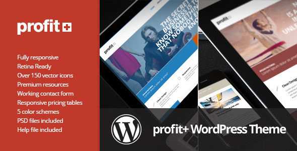 Profit+. It is responsive, retina ready WordPress theme. This Multipurpose theme is perfect for freelancers, creative people, bigger and smaller businesses. It is responsive so it will look perfect on any device it is also ready for retina devices. This theme coming with 5 pre-made theme skins, powerful theme options with ability to change typography (choose from standard and 600+ Google webfont with live preview! ), Unlimited colors with colorpicker for theme skin and body background, great shortcode generator to build any element easily and much more!