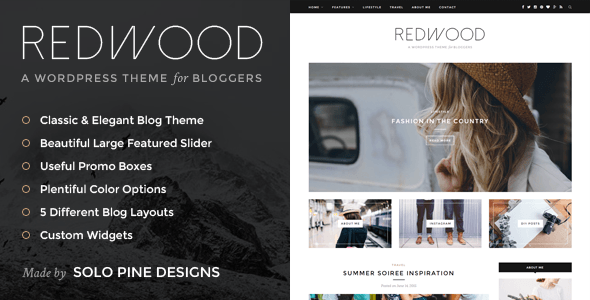 Crafted with bloggers in mind, impress your audience with Redwood’s classic, clean, and stately aesthetic. From its stunning slider and promo boxes to the plethora of color options, Redwood delights visually and functionally, giving you the power to customize your blog with just a click of the mouse. And if Redwood’s numerous features, robust options, and arresting design weren’t enough, rest assured knowing that your theme is backed by Solo Pine’s acclaimed customer service.