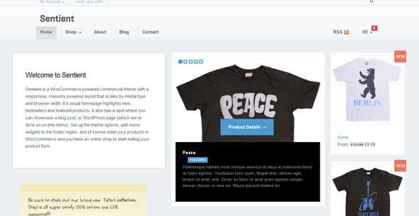 Sentient is a smart, innovative WooCommerce theme. Products are cleverly aligned using jQuery masonry allowing you to cleanly showcase a great number of products on your shop pages without any wasted space. Sentient has also been fully optimised for use on mobile devices such as tablets and smartphones.