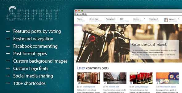 Serpent is a responsive social network WordPress theme build to power sites with multiple users and provide community content sharing.