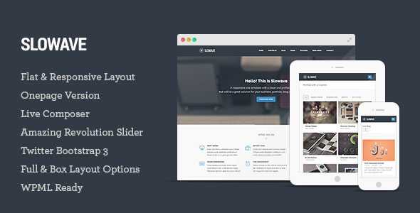 Slowave is a flat and responsive WordPress Theme with a clean and professional design which will be a great solution for your business, portfolio, blog or any other purpose website. Slowave was built with awesome Twitter Bootstrap v3 and it features a beautiful front-end page builder, unlimited colour combinations, full Google fonts integration & font controls.