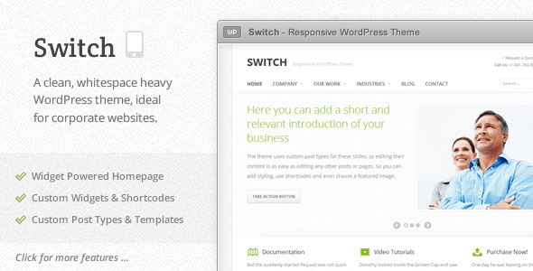 Switch is a clean, responsive WordPress theme, that allows you to build a professional looking website in minutes. The theme comes with 6 custom widgets and the homepage template is entirely powered by widget ready areas. No complex settings, no coding skills required, just the ability to drag and drop. You know how to drag and drop, right?
