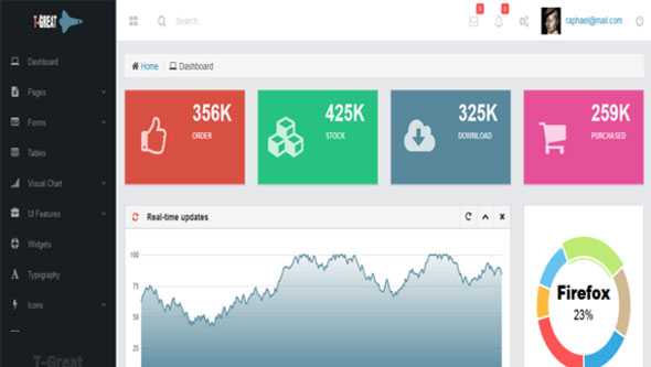 T-Great – Admin Template is a responsive Admin Dashboard with fully featured, premium, Bootstrap Admin Template with Modern Style. Based on Bootstrap 3.2 and Font Awesome support make this template easy to used. Extra Pages: Invoice Inbox Profile Pricing Tables 404 500 LockScreen Login Register Dashboard Plugin Support: autosize chosen datatables dropzone easypiechart editable flot fullcalendar gauge jquery-ui justgage jvectormap maskedinput mockjax moment morris placeholder raphael select2 sparkline touchpunch wizard xcharts