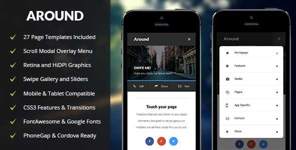 Simplicity ease of use, and content first design is the principle behind this elegant and beautiful mobile and tablet site template. With more than 27 page templates and hundreds of features we’ve also added a simple scrollabe modal menu that greets users from the top of the page without blocking view of your content. Around is a Mobile Template and a Tablet Template offering all mobile compatibility.