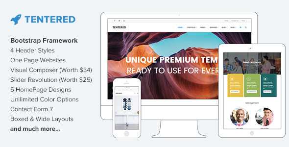 “Tentered” is a full functional powerful WordPress Theme designed & developed for Business, Corporate and Portfolio Websites. It is fully responsive template based on Twitter Bootstrap 3.x framework that makes it available for all screen sizes from the bigger ones to smartphones. Its not only responsive whereas it is retina ready also, now no blurry images on your HiDPI and retina devices.