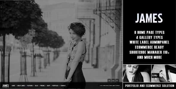 A comprehensive portfolio/blog theme that speaks for itself! This fresh and extravagant portfolio theme speaks for itself and will definitely appeal to your audience. James has spectacular features in full screen to showcase your portfolio or blog. This theme contains everything you need to surprise and impress your client(s). James also provides an easy solution to sell your work online and offers integration options with the free ecommerce plugin eShop.