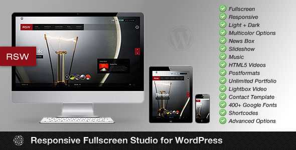RSW ( Responsive Fullscreen Studio for WordPress ) is a powerful theme for photographers and creative artists and comes with Light and Dark with theme options supporting multicolor customization of theme elements using color pickers. Creative artists can easily display their products using unlimited portfolio and post formats supporting Aside, Quote, Audio, Video, Link, Image and Gallery. The fonts can be changed using 400+ Google Web fonts choices in theme options.