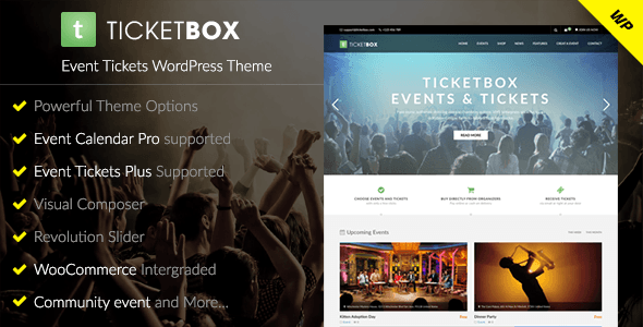TicketBox is a very elegantly designed WordPress theme built to create a website for Concert, Conferences, Events, Meetups, Sports and Exhibitions. The theme will help you to Sell conference ticket online by using Event Tickets Plus or you can also sell your event ticket using WooCommerce, to add daily schedules, to promote your speakers, to organize and create awesome Events.
