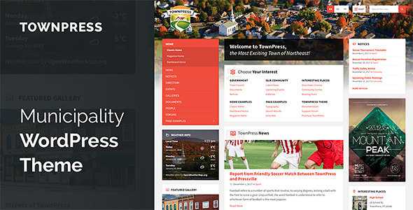 TownPress is an ideal WordPress theme for small towns or villages. It is tailored to suit all the basic needs of a modern municipality. TownPress offers a lot of very niche-specific features like local weather widget, upcoming events, town documents, galleries, forums (via bbPress plugin) and more. A great theme for your city or town portal!