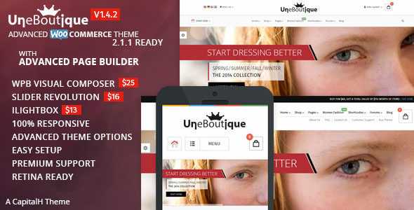 Une Boutique – Advanced WooCommerce theme is a clean, feature full theme for WordPress and WooCommerce. With the power of Visual Composer advanced page builder, and Slider Revolution and iLightBox premium plugins, Une Boutique brings to you one of the most complete WooCommerce themes on Themeforest to help you start your online store beautifully and with ease.