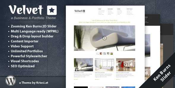 Velvet is a minimal business and portfolio Theme, that uses a very elegant Ken Burns Slider for image presentation. It is built on one of the most flexible WordPress Themes on Themeforest. With the help of a dynamic Template Builder you can create stunning page layouts without any coding knowledge.