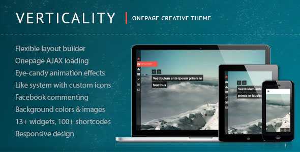 Verticality is a responsive onepage creative photography theme aimed to power complex portfolio and image-related sites or blogs available for a very special price. Verticality uses a framework that permits the site to be accessed on all mobile devices, including iPad and Android powered tablets.