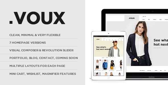 Voux is a professional WooCommerce shopping theme for WordPress built with Bootstrap and powered by Visual Composer. The theme is suitable for any kind of shop raging from clothes to electronics thanks to it’s minimalist design, it’s main focus on images and custom modules specially created for easy content creation.
