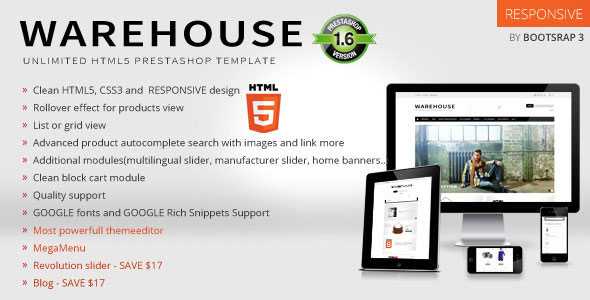 Warehouse utilizes many advanced modules and modifications like(rollover images, clean cart, sliders, autocomplete, dialogs). Theme is SEO friendly and is Cross Browser compatible, it’s based on prestashop 1.6 default Bootstrap theme.